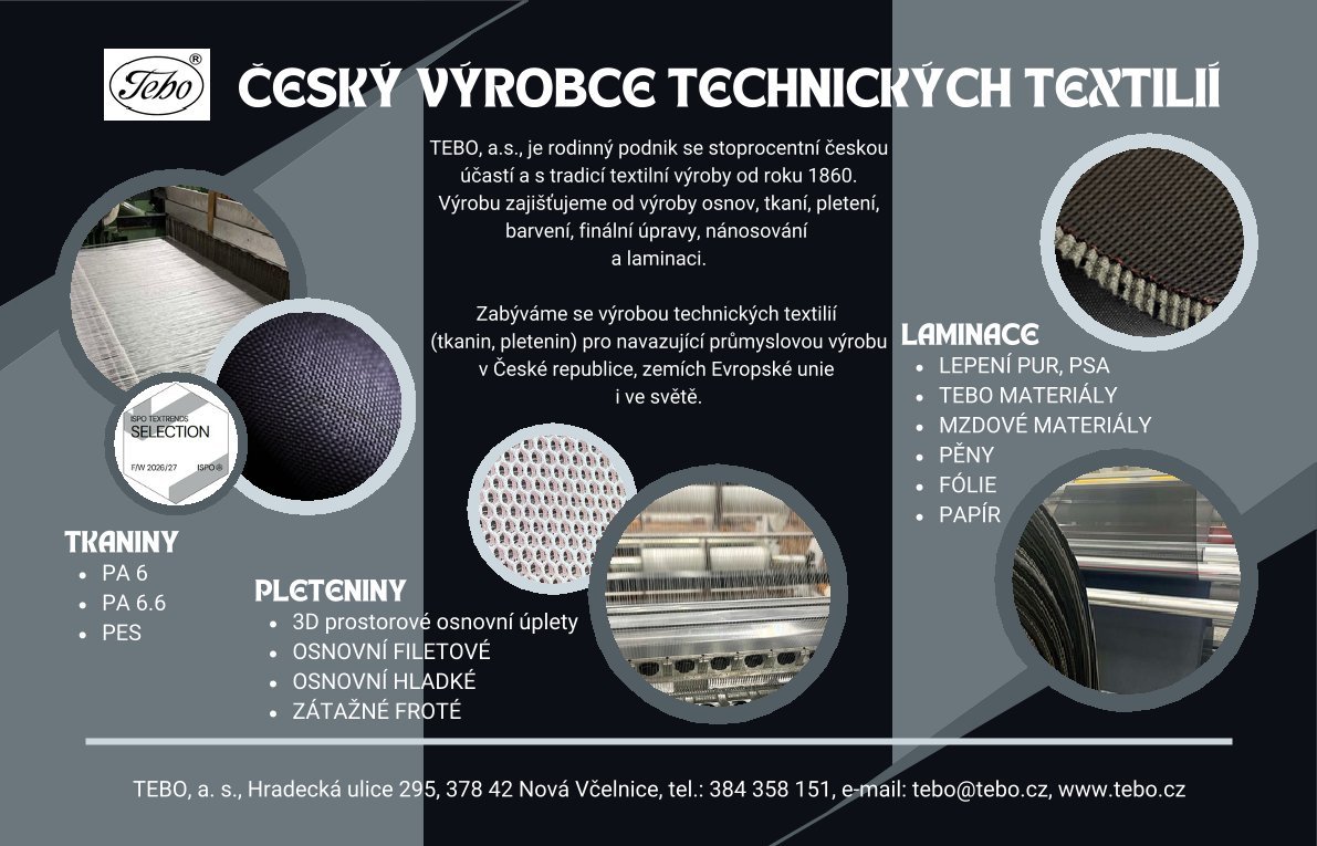 Již tak bohatý sortiment společnosti byl nedávno rozšířen díky nové high-tech laminovací lince, která splňuje i ty nejnáročnější požadavky na přesnost, odolnost a komfort. V nabídce TEBO se setkáte s tradiční, recyklovanou textilií, 3D pleteninou (např. TEBOX BOB) a specializovanými lamináty. Mezi hlavní benefity společnosti patří schopnost plnit přesné specifikace zákazníka, a to i v malých sériích.